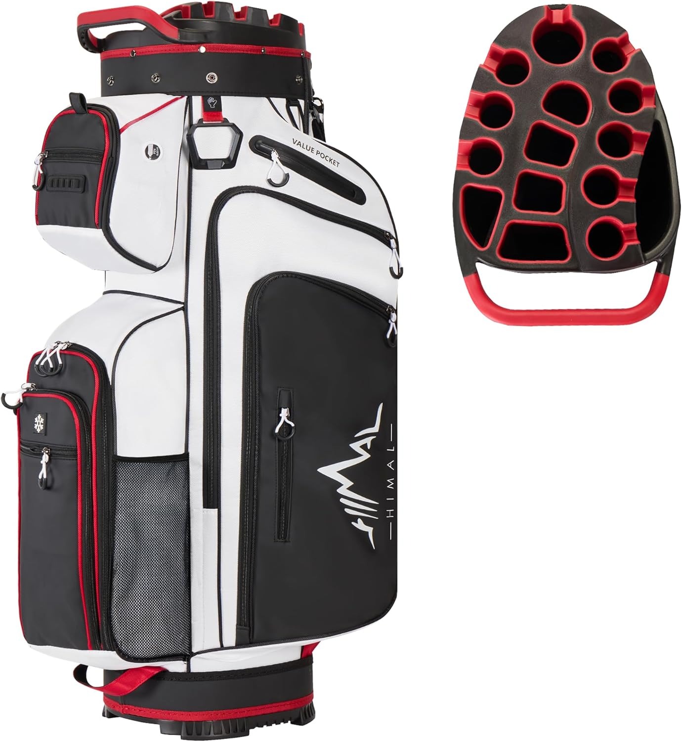 14 dividers for clubs.Ample storage, including a cooler and valuables pocket.